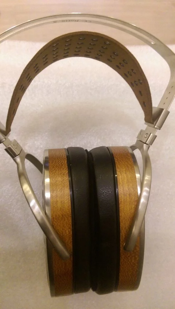 Su parrilla metálica simplemente me encanta, combinándola con las copas forradas en madera chapada, el aspecto es sensacional, luego fijándome en el interior de las copas, veo que tienen unas planchas de acero delante y detrás, son prácticamente una copia a las planchas de acero Fazor de Audeze, los pads son enormes, creo que incluso mas grandes que los pads de los sennheiser HD800, los pads son una mezcla de poli-piel con velour. Las copas giran sobre si mismas, apoyadas en una bonita diadema de metal y vienen con una correa de cuero con agujeros transpirables, para que se adapten como un guante a mi cabeza.